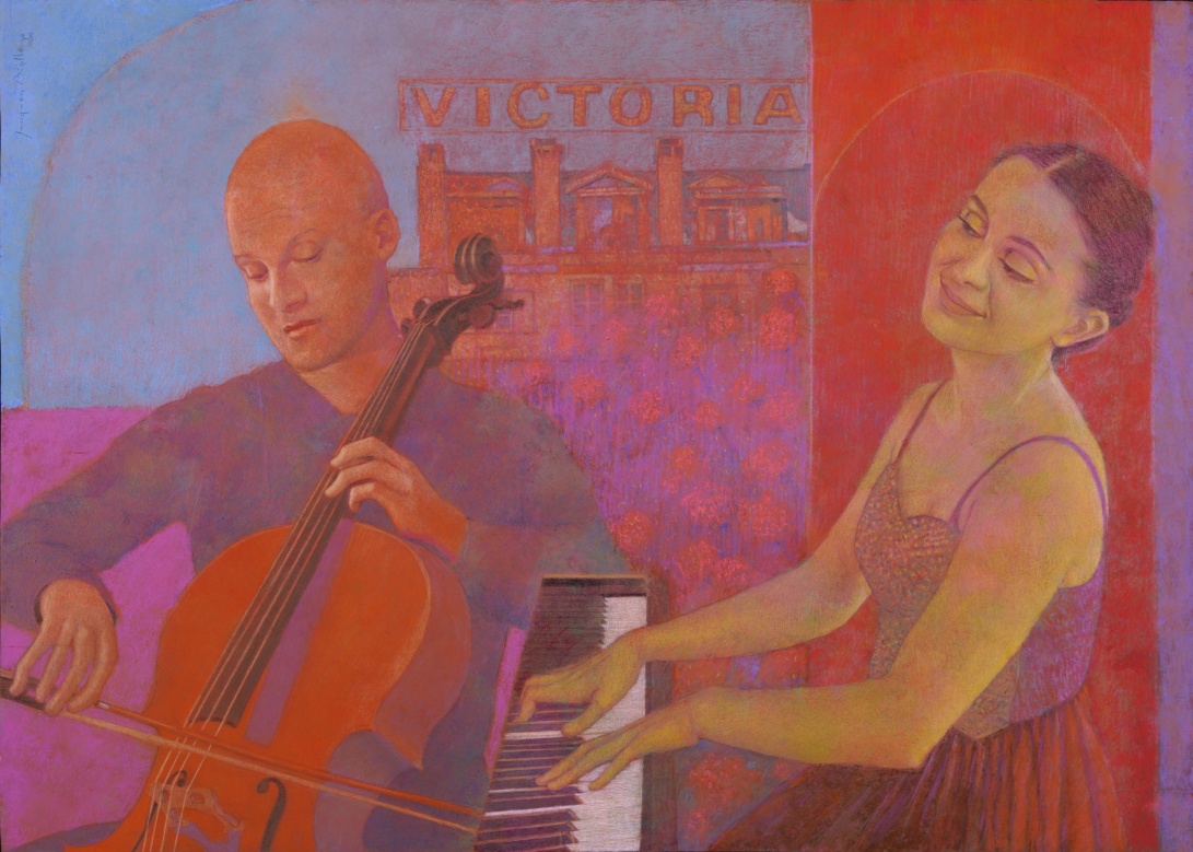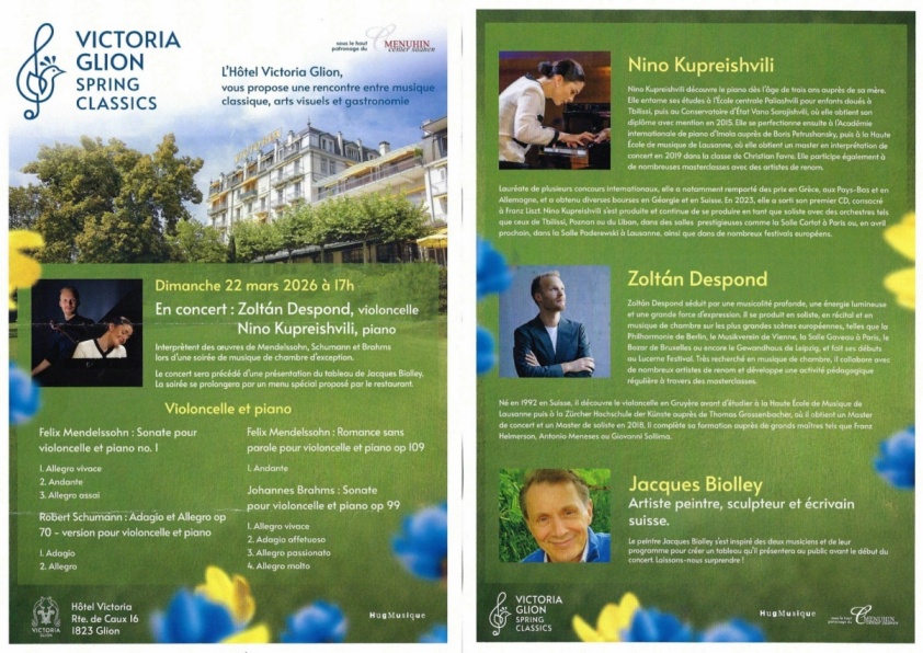 Présentation, dans le cadre des « Victoria Glion Spring Classics », à l’Hôtel Victoria de Glion, d’une œuvre représentant le duo composé du violoncelliste Zoltan Despond et de la pianiste Nino Kupreishvili, cela avant leur concert donné le 22 mars 2026.